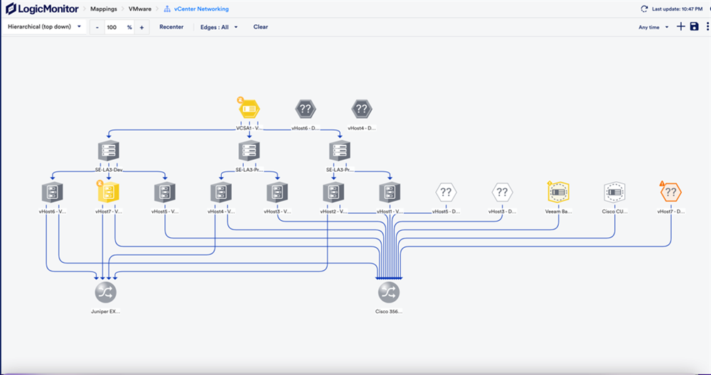 LogicMonitorのトポロジーマッピング機能は、ネットワーク、サーバー、ストレージ、データベースなど、企業インフラ全体の構成要素を視覚的に関連付け、サービス単位での監視を可能にする革新的な機能です。